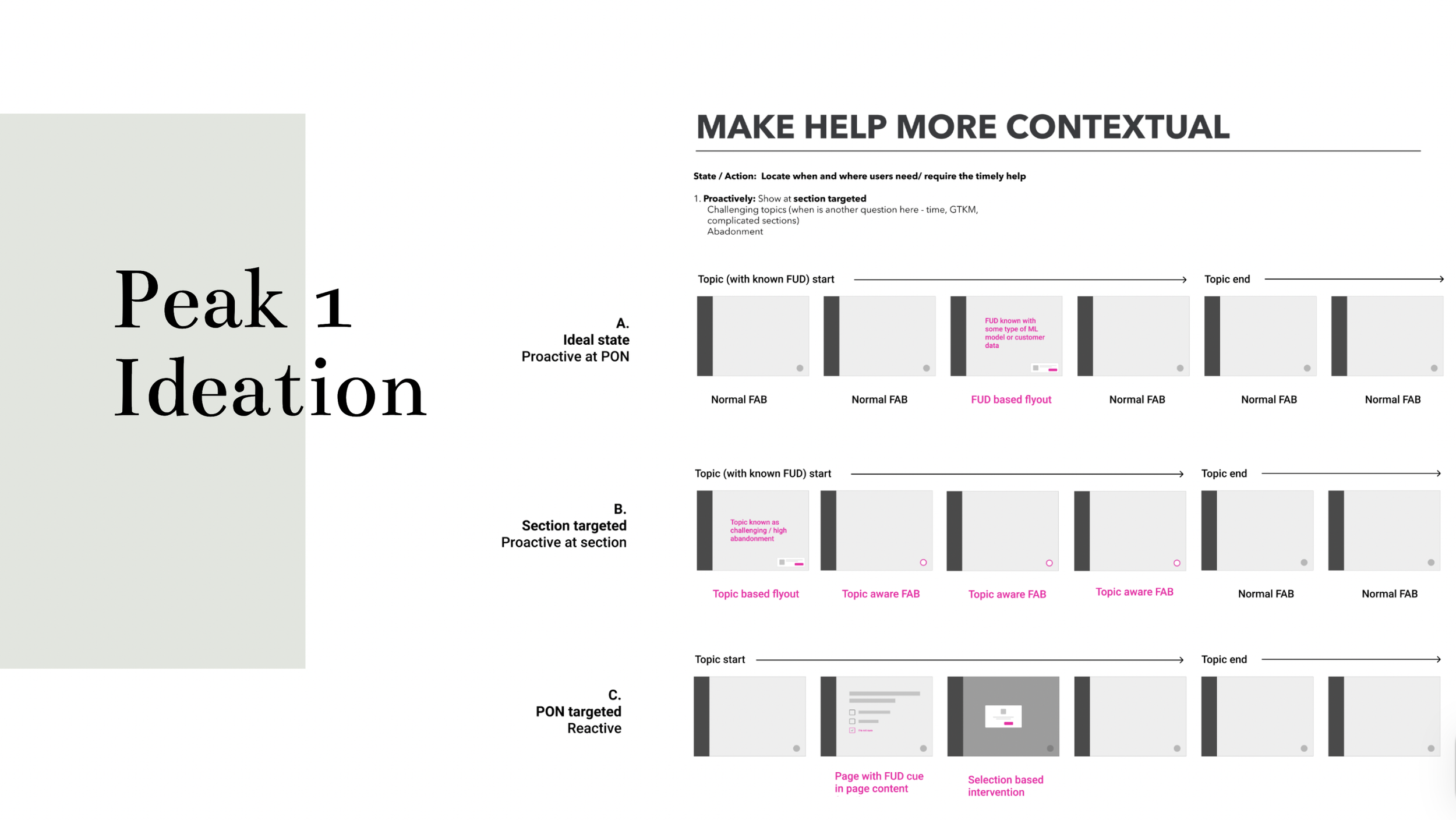 Design Process: Two-peak ideation approach focusing on lowering barriers to connect with experts and making help more contextual through proactive and reactive interventions.